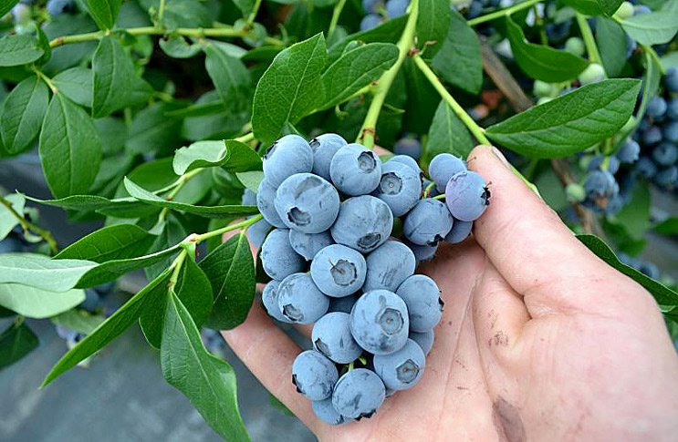 La récolte des bleuets se caractérise par des rendements élevés. Les deux premières années, le rendement d'un arbuste est d'environ 2 à 3 kg par saison, les années suivantes il passe à 6 à 9 kg (selon les pratiques agricoles). Dans certaines exploitations, la culture est pratiquée à l'échelle industrielle, avec une récolte automatisée.